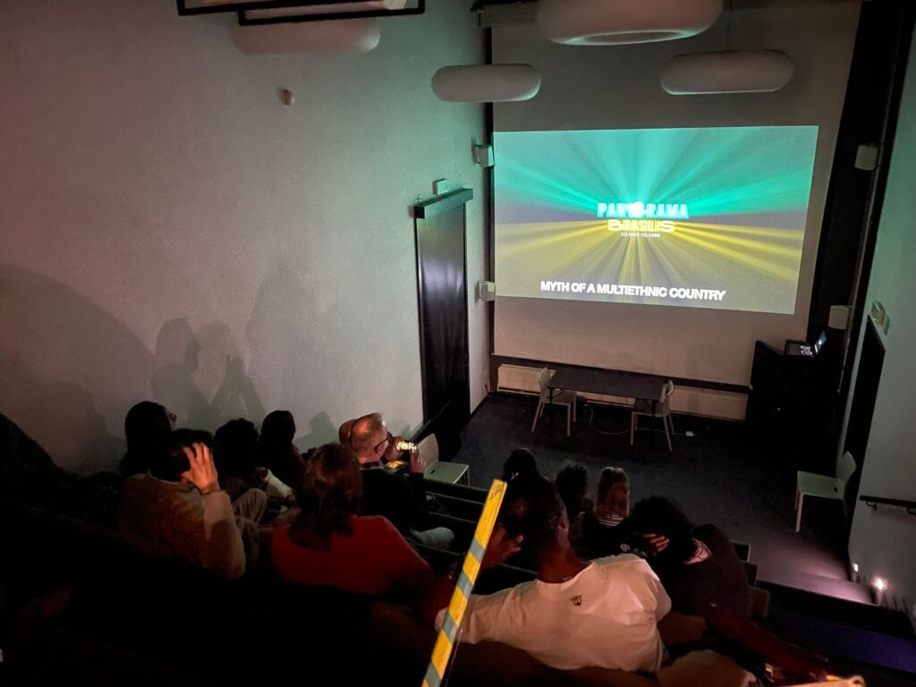 A segunda sessão do Cine Club Panorama Brasilis foi dedicada ao Dia da Consciência Negra, celebrado em 20 de novembro no Brasil, que homenageia a luta contra o racismo e a desigualdade, além de valorizar a cultura e a história afro-brasileira. A data marca o aniversário de morte de Zumbi dos Palmares, líder quilombola e símbolo da resistência negra. Nosso cine clube não quis de de nenhuma forma deixar passar essa data tão significativa que tem a ver com toda a formação cultural, identitária e de luta do povo brasileiro. O evento contou com a participação de Isaar França, pernambucana, cantora e realizadora do videoclipe Mundo Afora. A sessão foi aberta com uma apresentação de cantos de Candomblé e poesias de poetisas negras recitadas por Sol dos Santos e acompanhada pelo músico Juruna.